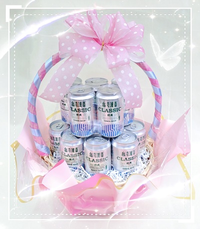 【使用花材】台灣啤酒.緞花.籐籃