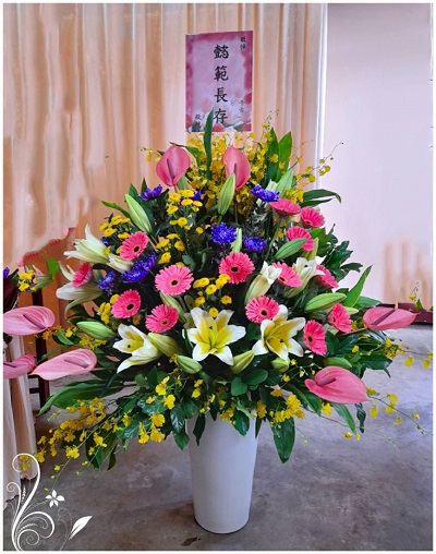 【使用花材】香水百合、富貴花、太陽花、文心蘭、火鶴花、黃梔、高腰瓷盆