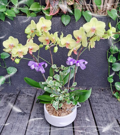 【使用花材】蝴蝶蘭(花色依季節搭配)、飾品、盆器